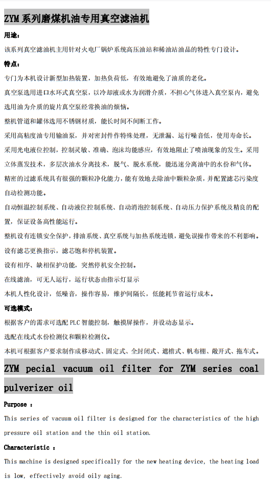ZYM系列磨煤機(jī)油專用真空濾油機(jī)